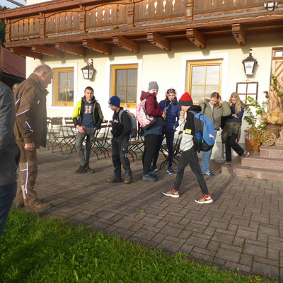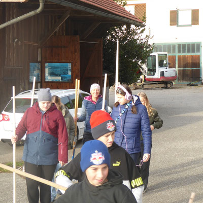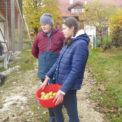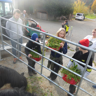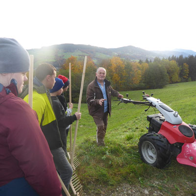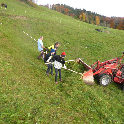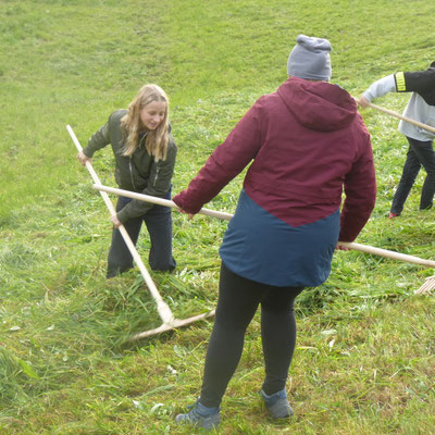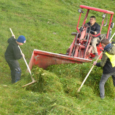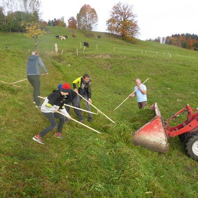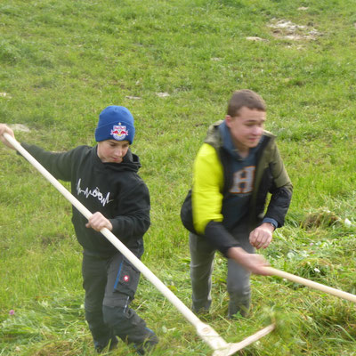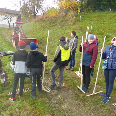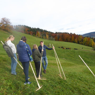 Beim Hochserner durften wir bei der Landschaftspflege helfen. Gaderer Lois mähte mit dem Motormäher die steile Wiese, das Gras wurde von uns mit Holzrechen in Zeilen gebracht und auf den Hoftrack aufgeladen. Anschließend wurden noch Birnen geklaubt und Tiere gefüttert, bevor wir dann zu Apfelsaft und frischem Apfelstrudel eingeladen wurden. Vielen Dank an alle Beteiligten - auch an Bettina Pöllmann, die die Aufgabe der Organisation nun von Lisa Klinger übernommen hat!!!